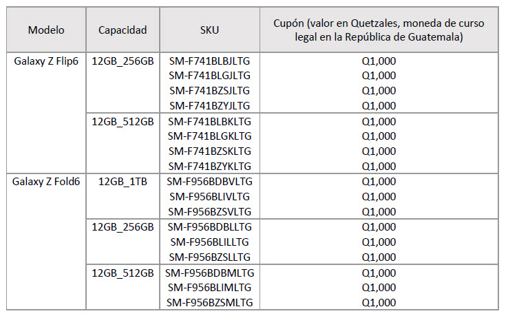 Este documento contiene los Términos y Condiciones Generales (TCGS) que regirán la dinámica para la entrega y uso por parte del Cliente (Cliente se entiende como el comprador de Smartphones Galaxy Z6 de marca SAMSUNG) de los cupones de regalo por la compra de los Smartphones Galaxy Z6 participantes que se detallan en el cuadro siguiente (en adelante Dispositivo o Dispositivos) en el periodo de lanzamiento establecido y vigente para el territorio de la República de Guatemala, el cual queda comprendido del 7 al 31 de agosto de 2024.